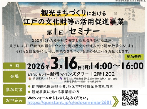 東京観光財団は3月16日、都内観光協会・区市町村担当者および観光事業に携わる事業者を対象に、「観光まちづくりにおける江戸の文化財等の活用促進事業」第1回セミナーを開催する。