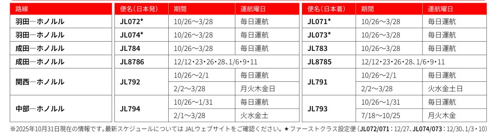 羽田/成田/関西/中部—ホノルル線のJAL便名JAL運航便
