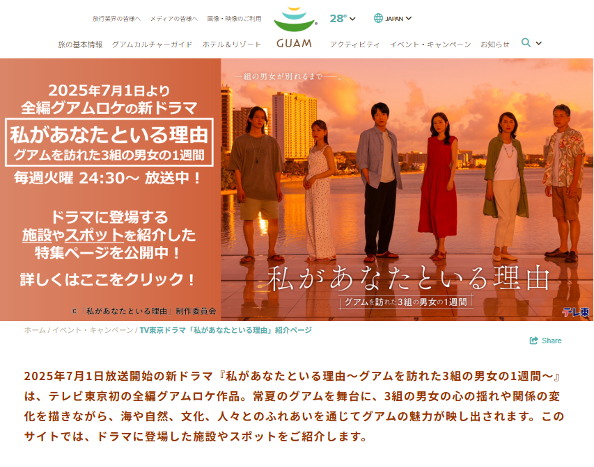 全編グアムで撮影されたテレビ東京系列のドラマ『私があなたといる理由』の効果も期待できる。FY25の好調の背景には、グアムがテレビメディアに露出した後に、適切なタイミングで関連する商品を販売するという旅行会社の協力があった。GVB日本オフィスでは「聖地巡礼」や「推し活」を促す動画の制作に着手しており、近日中に公開する予定で、キャラクターとのコラボレーションも視野に入れている。今後も各種メディアへの露出を増やしていく方針に変わりはなく、秋葉氏は「露出後に適切なタイミングで関連商品が販売されるように、旅行各社と密接に