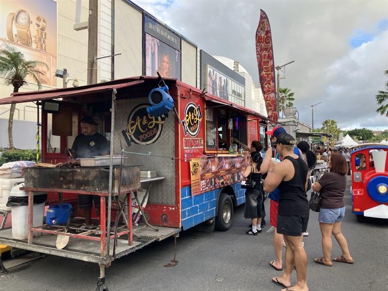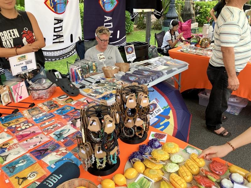 会場となったのは、サンドキャッスルとデュシットビーチリゾートグアム間のホテルロード。このエリアは歩行者天国となり、グアム名物のBBQをはじめ、チャモロ料理や人気グルメ、新鮮なフルーツを使ったフレッシュジュースなどを販売するフードトラックが並んだ。さらに、地元特産の唐辛子やココナッツを使った「メド・イン・グアム」のお土産品も登場し、多くの来場者が好みの味や品を求めて列を作った。物販ブースでは、ローカル人気アパレルブランドやアクセサリーショップなども出展し45店舗以上が軒を連ねた。
